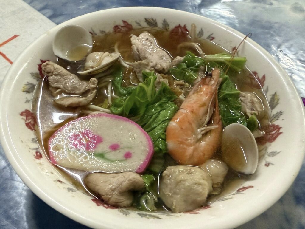 來到了站前廣場,一旁的食堂漂來的香味吸引了我的注意,這一間傳承三代的食堂保留了家鄉的好味道,料多到快滿出來的什錦麵,裡頭有蛤蠣、蝦子還有豬肉、貢丸…等,飽足感滿滿;另外紅糟肉及豬腳更是客家庄必點的美食。